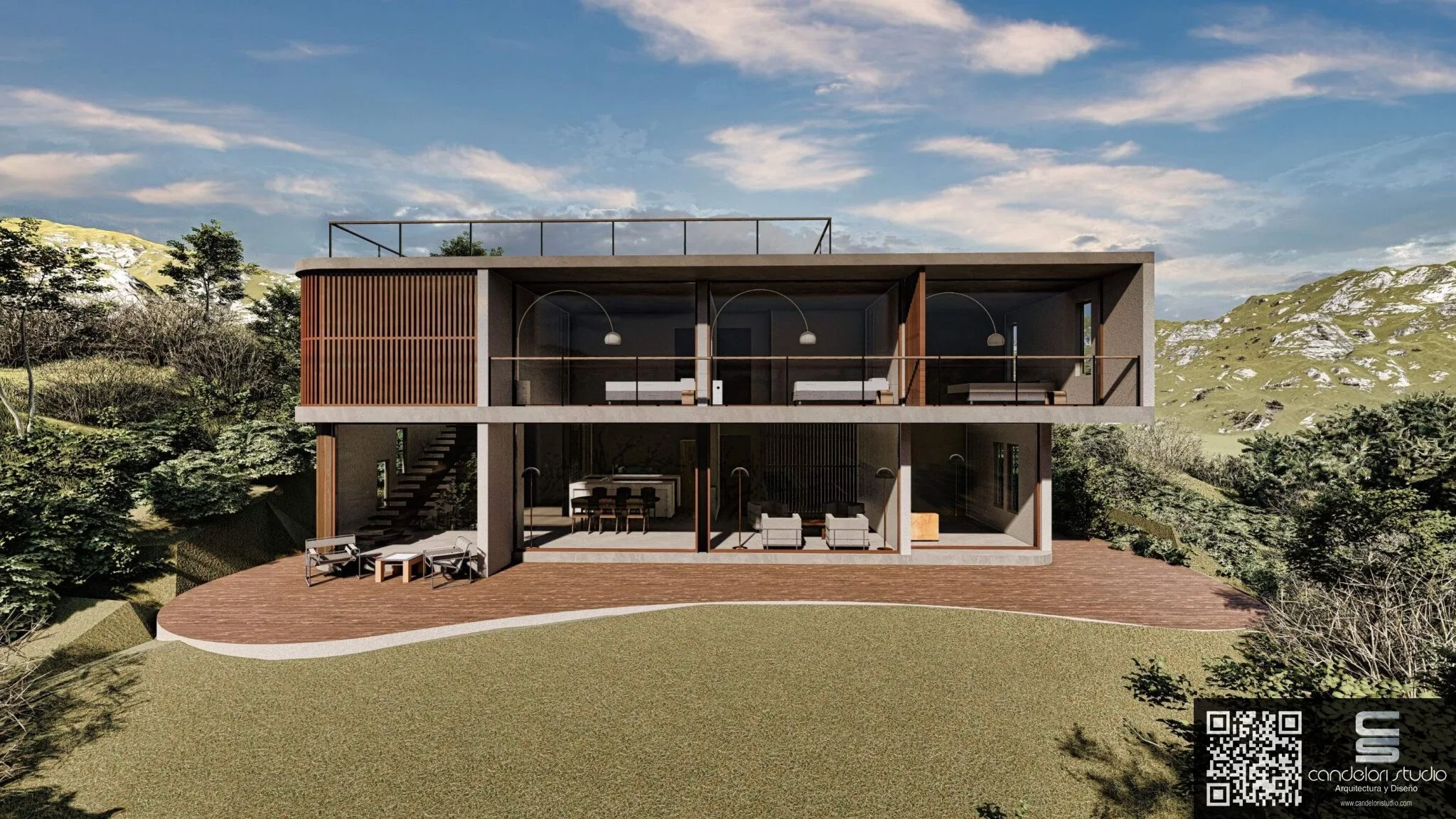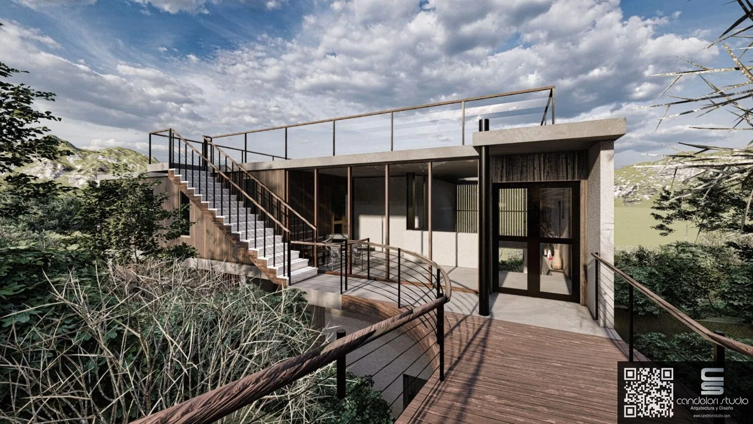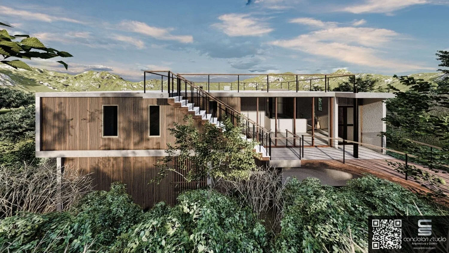 Esta vivienda unifamiliar de dos pisos, ubicada en Cachagua, se organiza para disfrutar de las vistas del entorno visible en áreas privadas y públicas. El acceso posterior, genera una entrada a través de un puente que recorre el paisaje. Al ingresar, la vivienda se abre hacia las amplitud de vistas integrándolo al interior del Living facilitando una fluida interacción entre los distintos ambientes, también completa la casa con luz natural y vistas para dormitorios en un segundo nivel, utilizando sistemas de quiebravistas para un control solar preciso, creando un ambiente controlado, luminoso y ventilado. La orientación estratégica de la casa sigue el recorrido solar, maximizando la iluminación natural y optimizando el confort térmico en las zonas más frecuentadas durante el día.